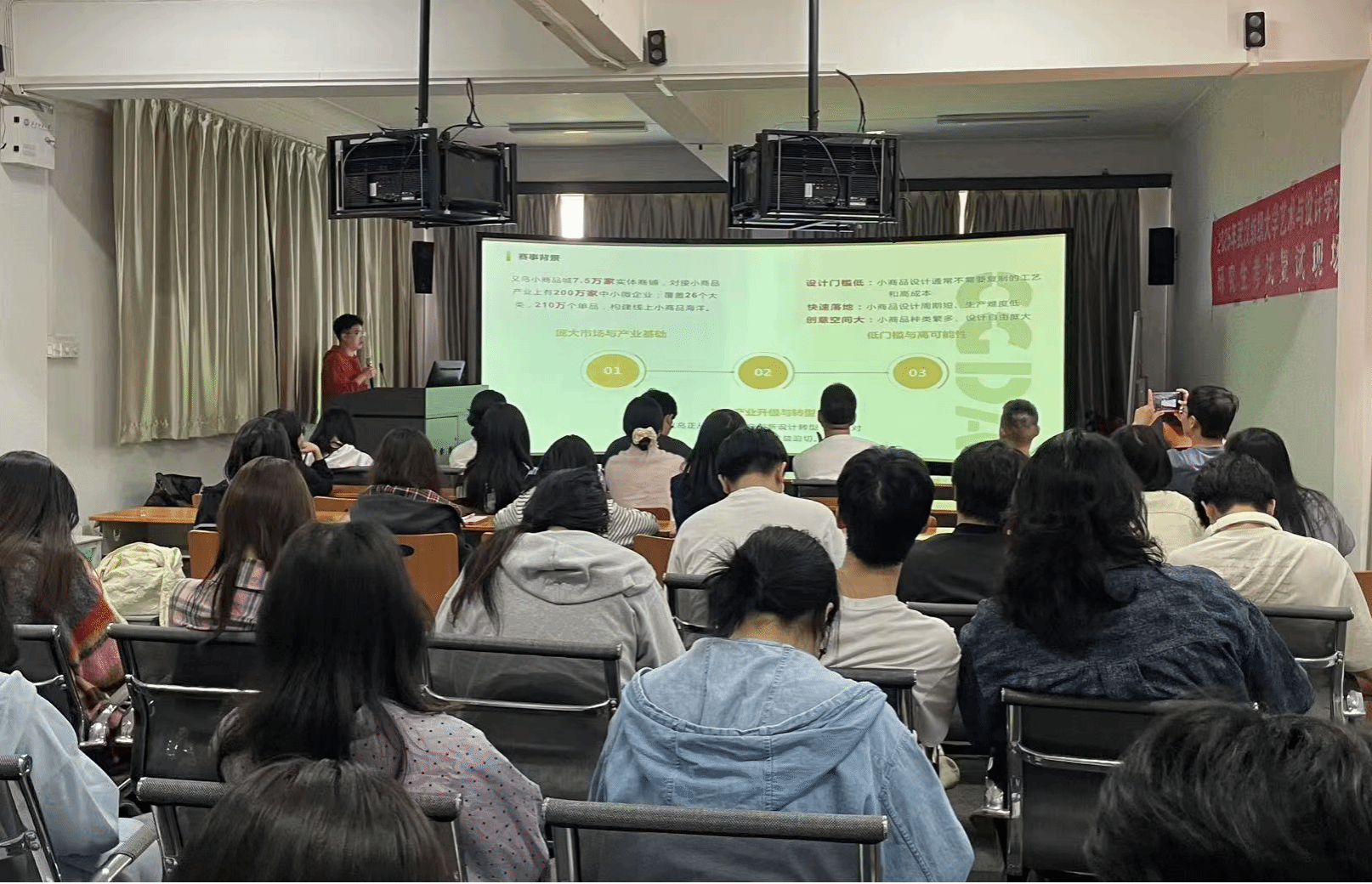作为未来设计师·全国高校数字艺术设计大赛(NCDA)的专项赛道,义乌中国小商品城杯赛事以“创意义乌,创联世界”为核心理念,通过解析往届的获奖作品,剖析了设计该如何兼顾实用性与美观性,鼓励学生积极参与到大赛中来,借助高校的创新力量,为行业发展注入新活力。张敬德结合市场趋势提出了户外露营冰包+野营垫二合一的功能创新设计,宣讲内容从产品外观、结构功能、工艺CMF等方面提出了许多建议。柳群豪分析了宠物行业的发展趋势,介绍了品牌的主营类目,强调宠物用品应关注“人宠共居”场景下的情感交互设计。