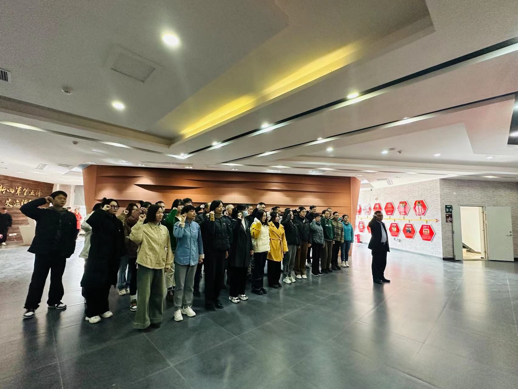 在展厅大厅,全体党员面对党旗重温入党誓词。