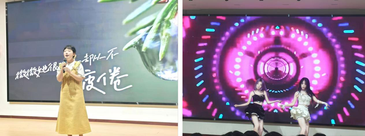 舞台上,本科生独唱《微微》以清澈嗓音传递治愈力量,研究生双人舞《you&me》凭同步律动迸发青春张力,一静一动交织出舞台火花。随后的互动环节将现场氛围推向高潮,新生踊跃参与“数字报读”游戏,紧张报数与出错瞬间的逗趣让现场笑声不断,同学们在协作调侃中快速破冰;竞猜环节中,熟悉的旋律引发抢答热潮,拉近了彼此距离。这些环节不仅促进了同学间的交流,也有效缓解了新生初入校园的焦虑与迷茫,在轻松氛围中强化了心理适应能力。