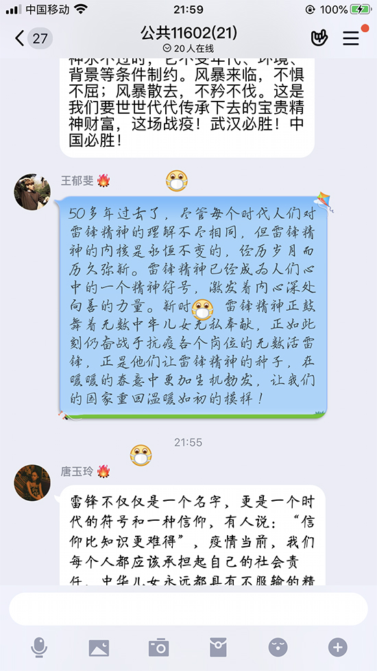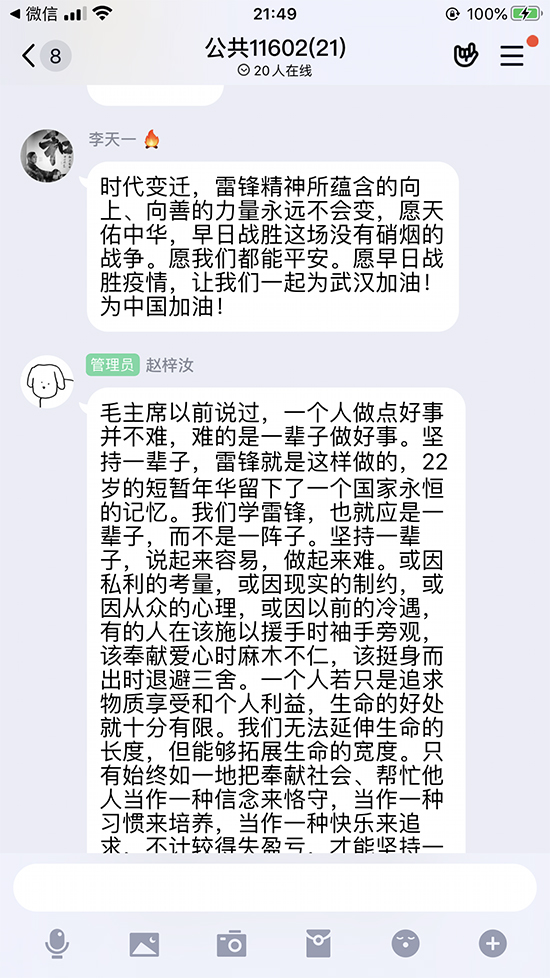 3月5日是“学雷锋纪念日”,为弘扬雷锋精神,推动志愿服务精神进一步在大学生心中扎根,2016级全体学生在线上开展了一次特殊的主题班会。