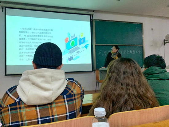 张瑜老师以“预防网络诈骗”为题,从什么是网络诈骗,网络诈骗的趋势,网络诈骗的类型,案例分析、防范措施和补救措施等六各方面,向同学们详细讲解了网络诈骗。张老师通过近几年发生在我院的网络诈骗的真实案例并结合自己接到过的网络诈骗的电话和短信,向同学们进一步分析了网络诈骗的危害,切实使大家提高安全防范意识。