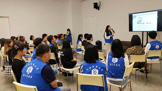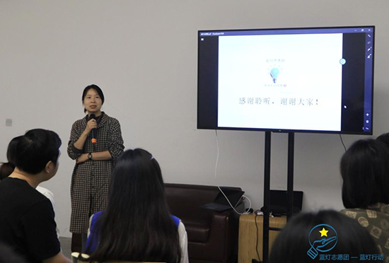 紧接着,蓝灯志愿团团长李多阳简要介绍蓝灯起源、发展、部门分工以及个人在团队中的成长感受,接着,蓝灯各部门部长以“我与星星的故事”作为交流主题,分别讲了自己与蓝灯的故事、部门工作内容等,大家通过丰富的ppt、生动感人的故事给在场的人一一分享,让大家感受到志愿者们对星儿们的爱心、对社会贡献一点自己力量的责任心。最后,团队指导老师漆晚霞进行了总结,并强调蓝灯有今日的成长是每一位志愿者辛勤付出所获得,也希望今后在与艺术村的合作中,蓝灯能够向公众展示志愿者精神!