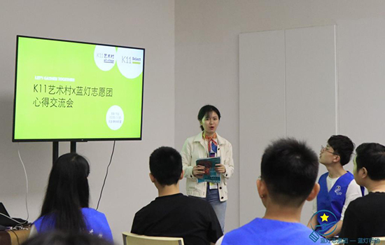 交流一开始,白女士简单讲解了4月份k11艺术村与蓝灯团队一起合作完成公共艺术装置“电血站—一元参与、为爱充电”的艺术家艺术作品展览的前期宣传情况以及展览进展的情况,她说,通过首次合作,团队双方都希望更深入地合作和了解彼此,故组织开展了“k11艺术村志愿团与蓝灯志愿团交流活动”,希望通过深入交流,能够从优秀志愿服务队得到更多的借鉴,开展更多有意义的合作!