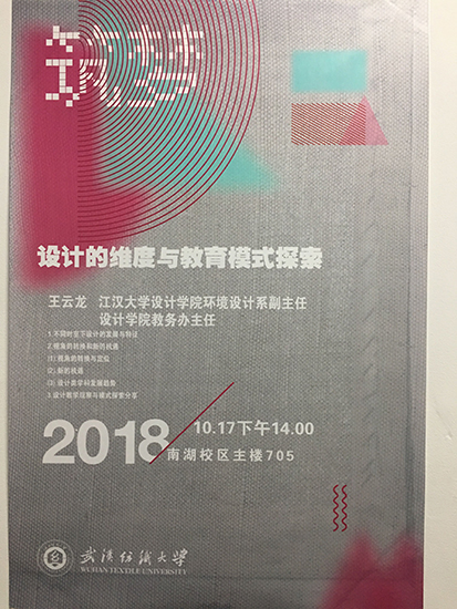 10月17日下午,艺术学院邀请了优秀校友江汉大学设计学院环境设计系副主任王云龙在南湖校区主楼七楼作了题为“设计的维度与教育模式探索”的专业讲座。讲座由艺术学院副院长曹凯主持。