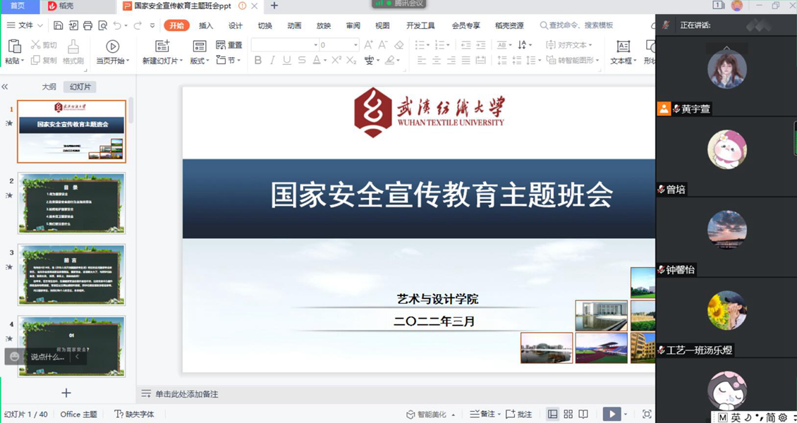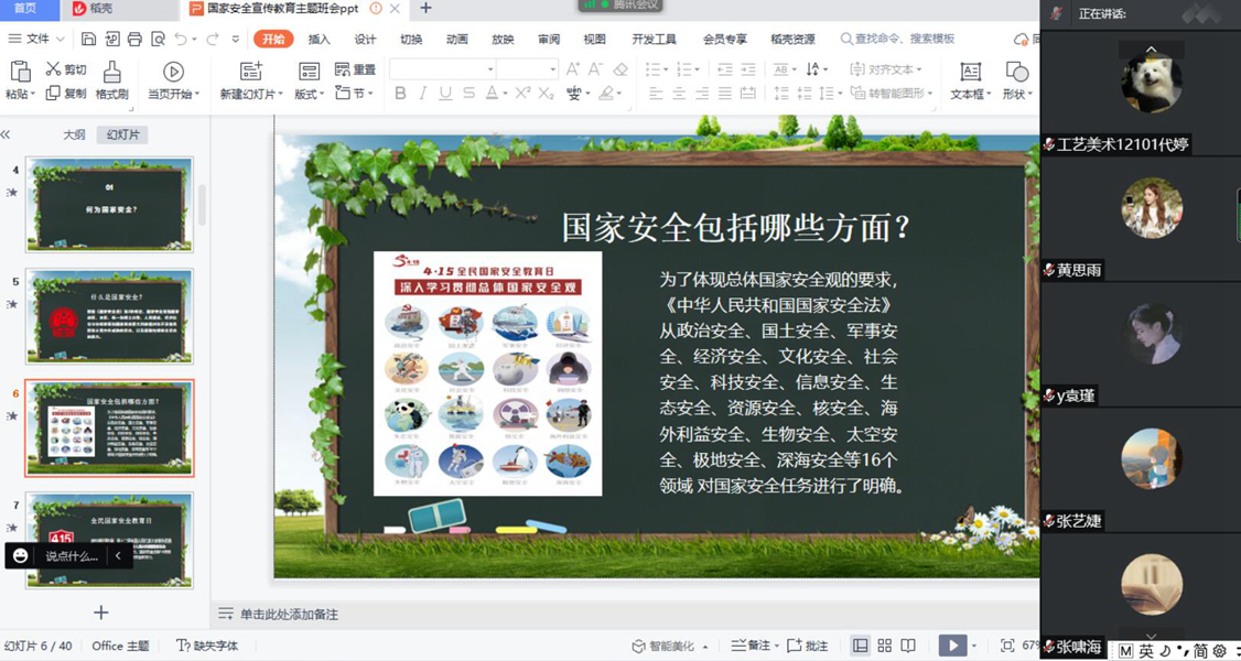 各班以PPT形式宣讲国家安全知识,通过《国家安全法》、《中华人民共和国刑法》中相关法律条文内容及具体实例讲解何为国家安全、危害国家安全的行为及相关罪名、如何维护国家安全等多个内容。2021级辅导员张啸海老师讲到,当今世界正经历百年未有之大变局,世界面临的不稳定性、不确定性更加突出,只有坚持总体国家安全观,才能统筹好发展与安全,应对好新的赶考之路上的各种风险挑战。近些年来,无论是一些国家和地区战火引发的难民危机,还是恐怖主义带来的社会恐慌,无论是核泄漏事故形成的环境污染、还是疫情失控造成的各种乱象,都在告诫我们,没有国家安全,何来幸福生活。安全是人民美好生活需要的重要内容,有了安全感,获得感才有保障,幸福感才会持久。