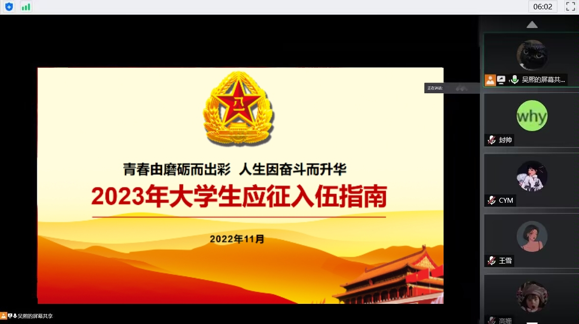 向同学们传达了学校关于征兵工作的相关文件要求,重点强调了大学生应征入伍的重要意义,结合身边学生实际案例,宣传了应征入伍学生在学业、升学、就业等方面的国家优惠政策,鼓励同学们携笔从戎,参军报国。