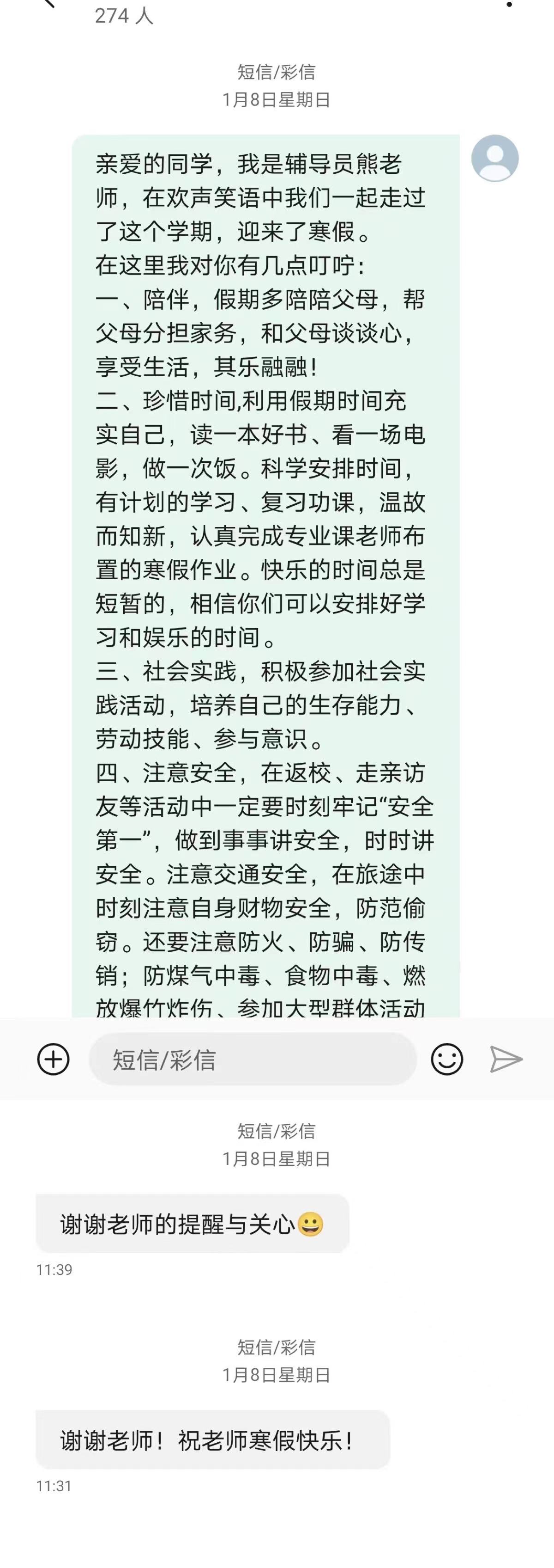 2022级本科生辅导员熊潇潇勉励同学们积极参与学校、学院组织的各项假期活动,丰富假期生活。