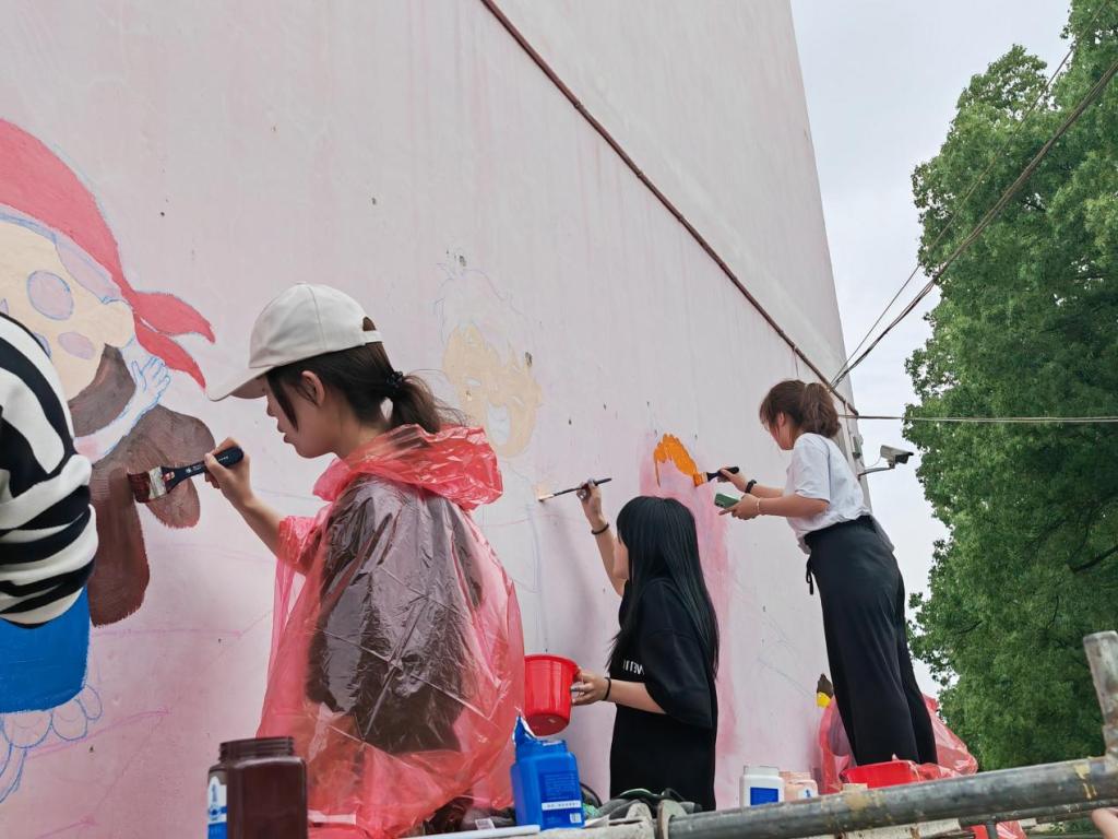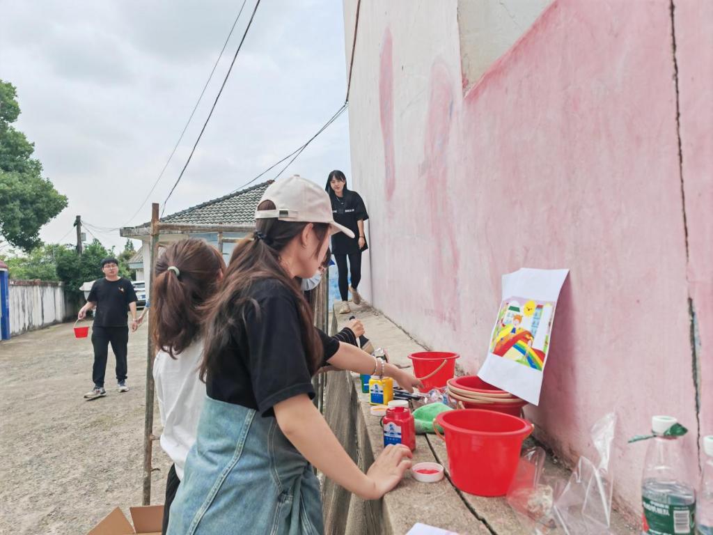 出发前,团队制定了详细的实施方案,一到现场,同学们迅速分工,按照分组进行绘画,整个彩绘过程有条不紊,井然有序。部分同学负责墙面起稿,其余同学帮助洗笔、分色、调色等准备工作,在进行基础的上色后,同学们对色调进一步调整,使作品更加完善。