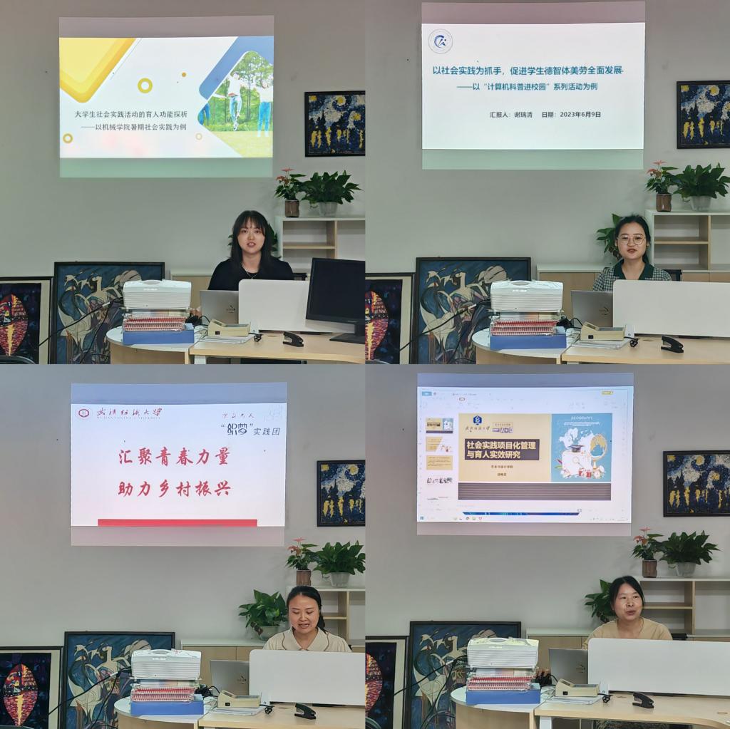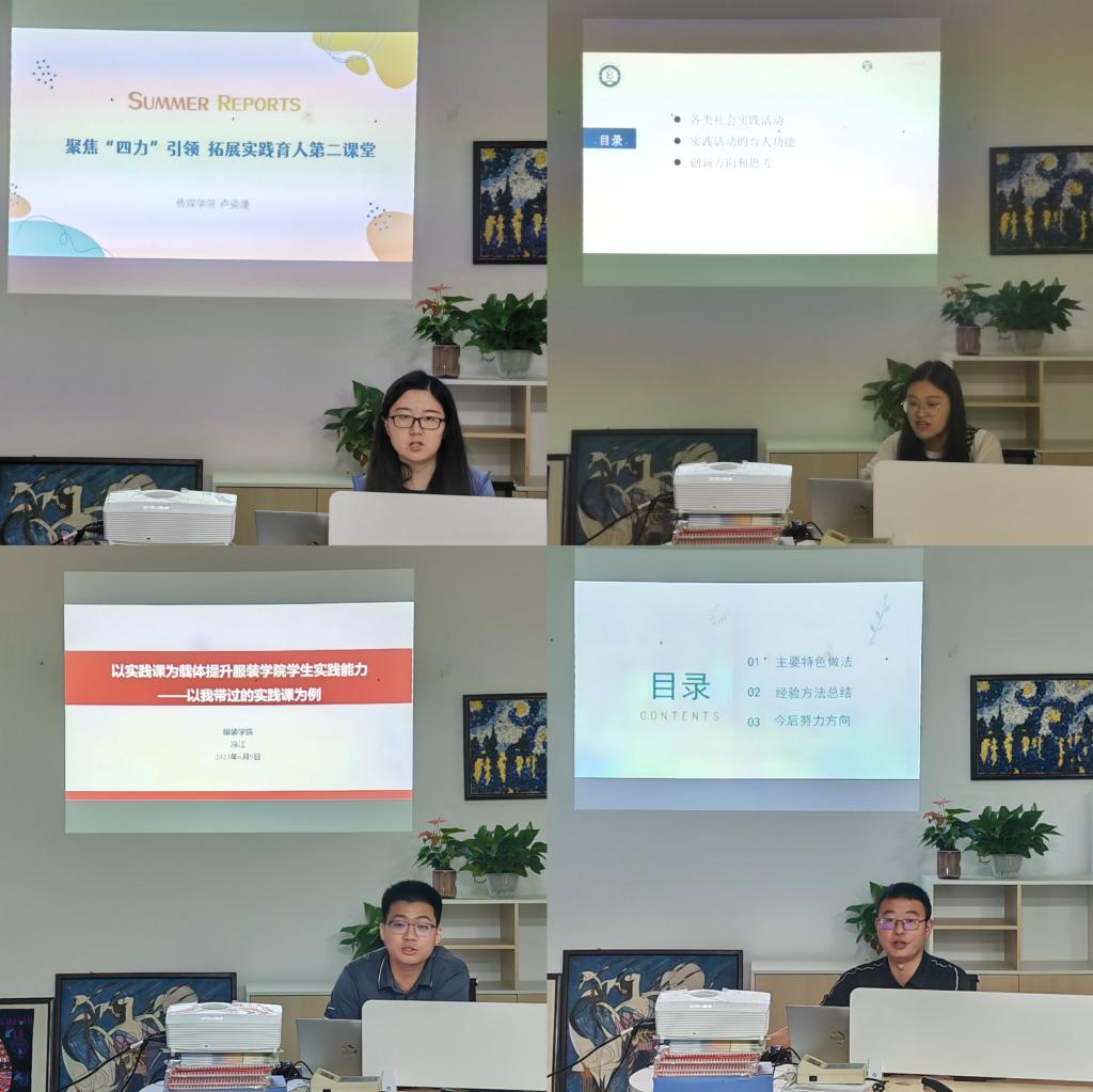 传媒学院卢姿潼以《聚焦“四力”引领,拓展实践育人第二课堂》为题,分享了传媒学院“四力”实践团队缘起、取得的实践成果以及未来展望。伯明翰学院徐钰以《高校实践育人模式的探析》为题,从学院开展的各类社会实践活动入手,浅析了社会实践活动育人功能、提出创新方向和思考。服装学院冯江以《以社会实践为载体提升服装学院学生实践能力的探析》为题进行分享,得出劳动实践课可以加强学生对劳动的认同感,采风调研课可以培养学生的专业兴趣,暑期社会实践课可以锻炼学生的专业实践能力。艺术学院张啸海以《艺术赋能乡村振兴,发扬实践服务精神》为题,分享了学院专业特色社会实践活动,强调将艺术文化与乡村振兴结合起来,大力弘扬中华优秀传统文化,将艺术展现在中国的乡村大地上。