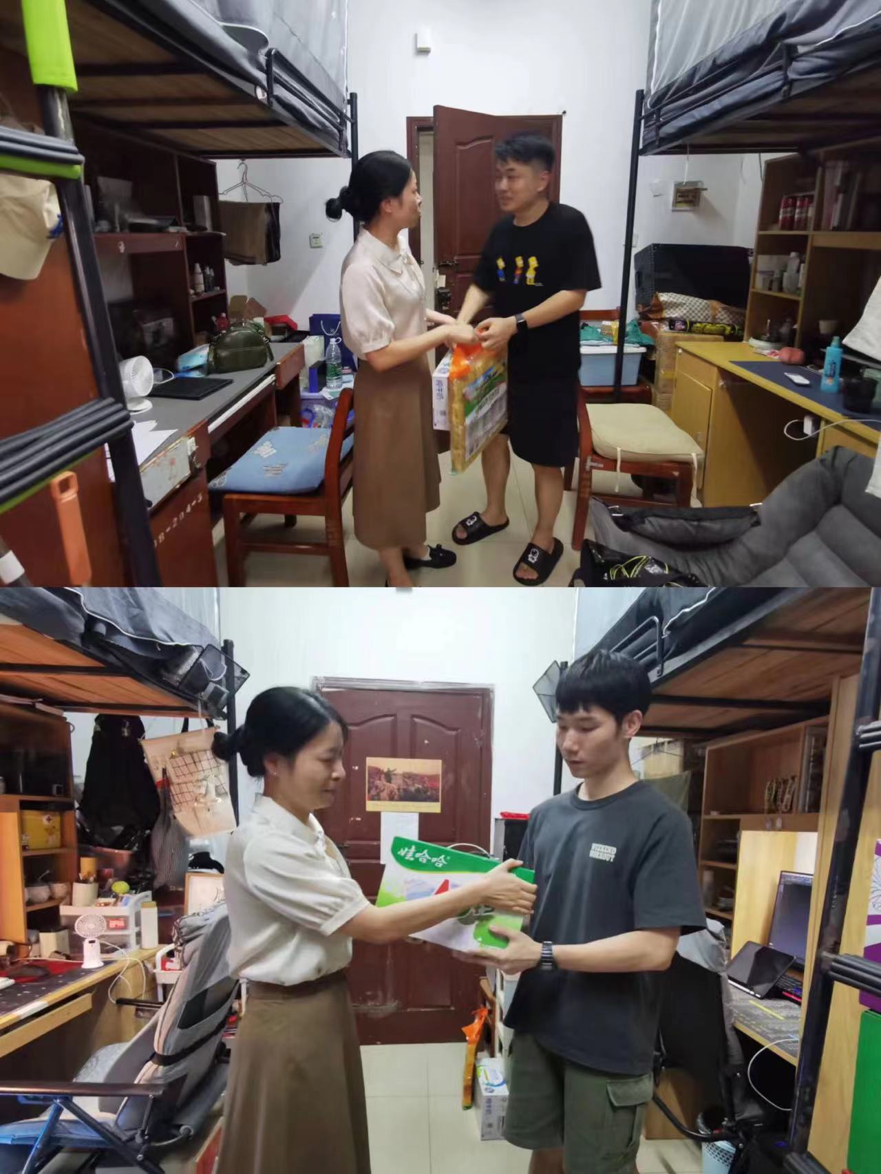 在南湖校区,漆晚霞依次走访研究生留校生,并送上慰问品,她亲切询问大家近期科研、论文、生活情况,鼓励同学们做好升学、就业规划,保持和导师的沟通、交流,同时也要严格遵守留宿期间管理,确保平安留宿。“宿舍同学每天都几点回来?天气炎热,注意避暑降温。”韩泽光每到一间宿舍都亲切关心同学们生活情况,针对考研同学专业选择、课程准备情况进行交流,鼓励大家坚定目标,树立信心,按部就班进行复习。