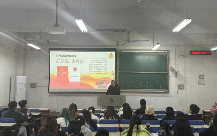 会议伊始,陈放老师通过大学生应征入伍指南介绍会议内容,并讲解服兵役的基本条件以及入伍流程。他从学习及生活方式上阐释了应征入伍的好处,并强调了入伍的重要性以及成为军人的光荣性,鼓励学生勇于参军。同时他还叮嘱同学们多学习、多反思,希望同学们坚定理想信念,坚定人民立场,练就自身过硬本领,投身于祖国发展的伟业。