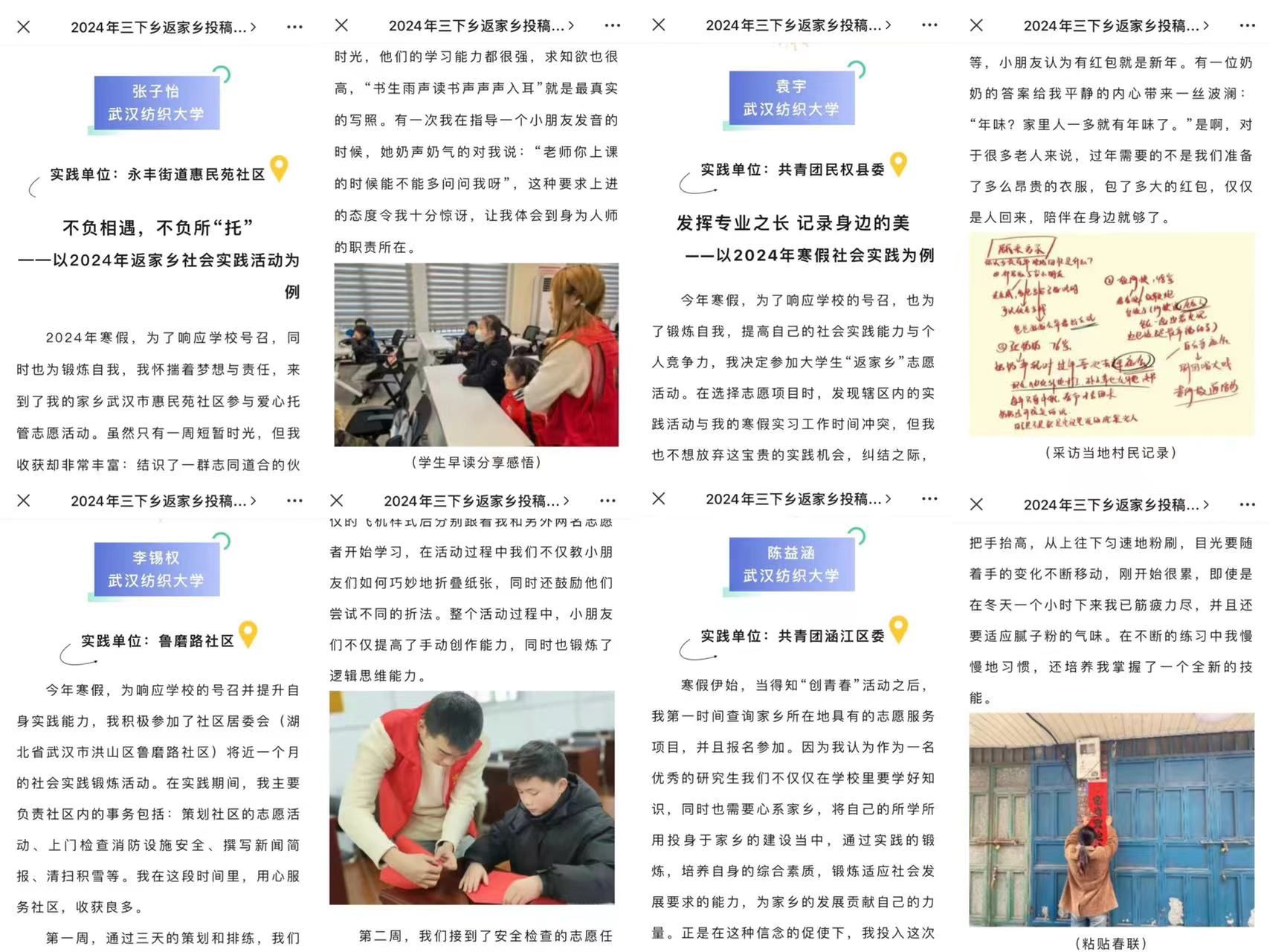 其中,成员张子怡在家乡湖北省武汉市惠民苑社区参与了为期一周的爱心托管志愿活动,她通过传授知识,体会到身为人师的不易,也感受到家乡孩童的可爱纯真;成员袁宇发挥自己的专业特色创作出具有家乡特色的年味短视频,宣传了家乡文化;成员李锡权在湖北省武汉市洪山区鲁磨路社区参加了长达15天的实践锻炼活动,体验工作人员的日常,对社区服务深有感触;成员陈益涵则在福建省莆田市涵江区参加萝苜田青春驿站服务项目,配合相关负责人员完成卫生整理、引导等工作,深入了解家乡的历史文化,感受到家乡文化中包含的强大精神财富参。参与本次返家乡活动同学收获颇丰,他们将实践经验进行理论产出,撰写了社会实践报告,在2024年三下乡返家乡公众号上进行了宣传报道。