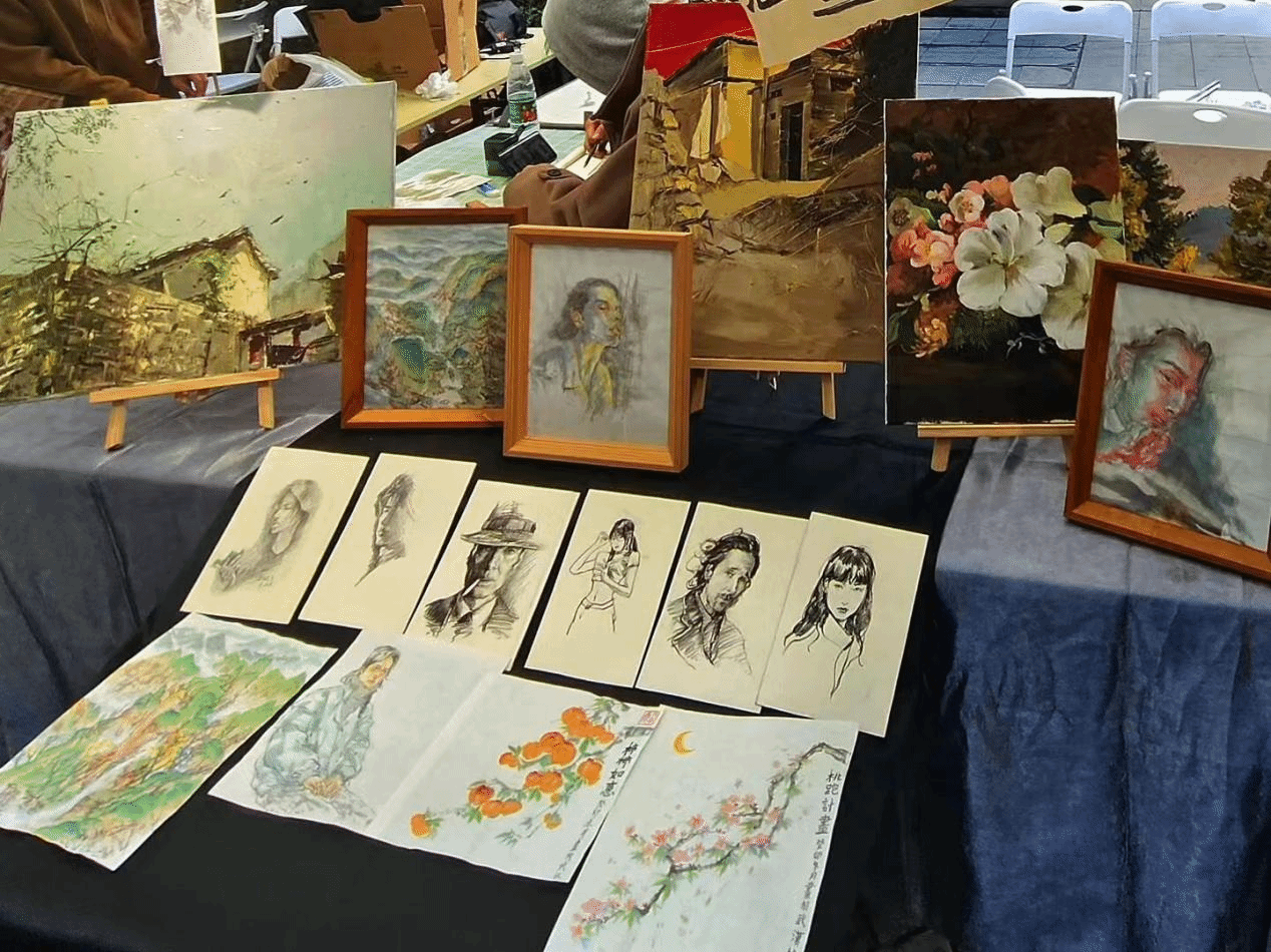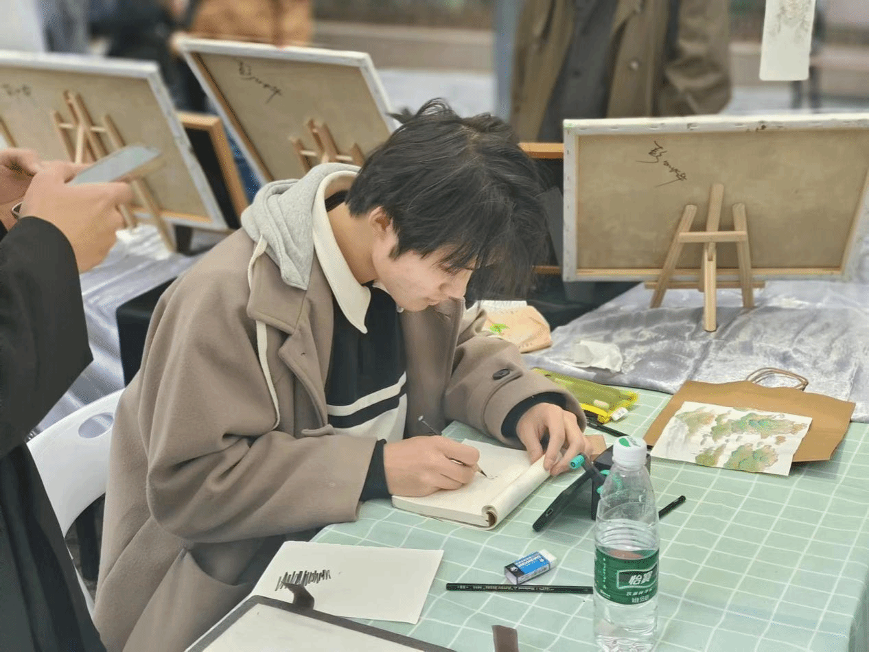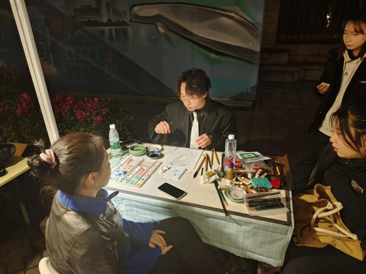 学生作品亮相热闹的黎黄陂路,同学们以创意集市形式面向广大市民,以学生课程作品展示、现场素描、题字等方式展现才艺。