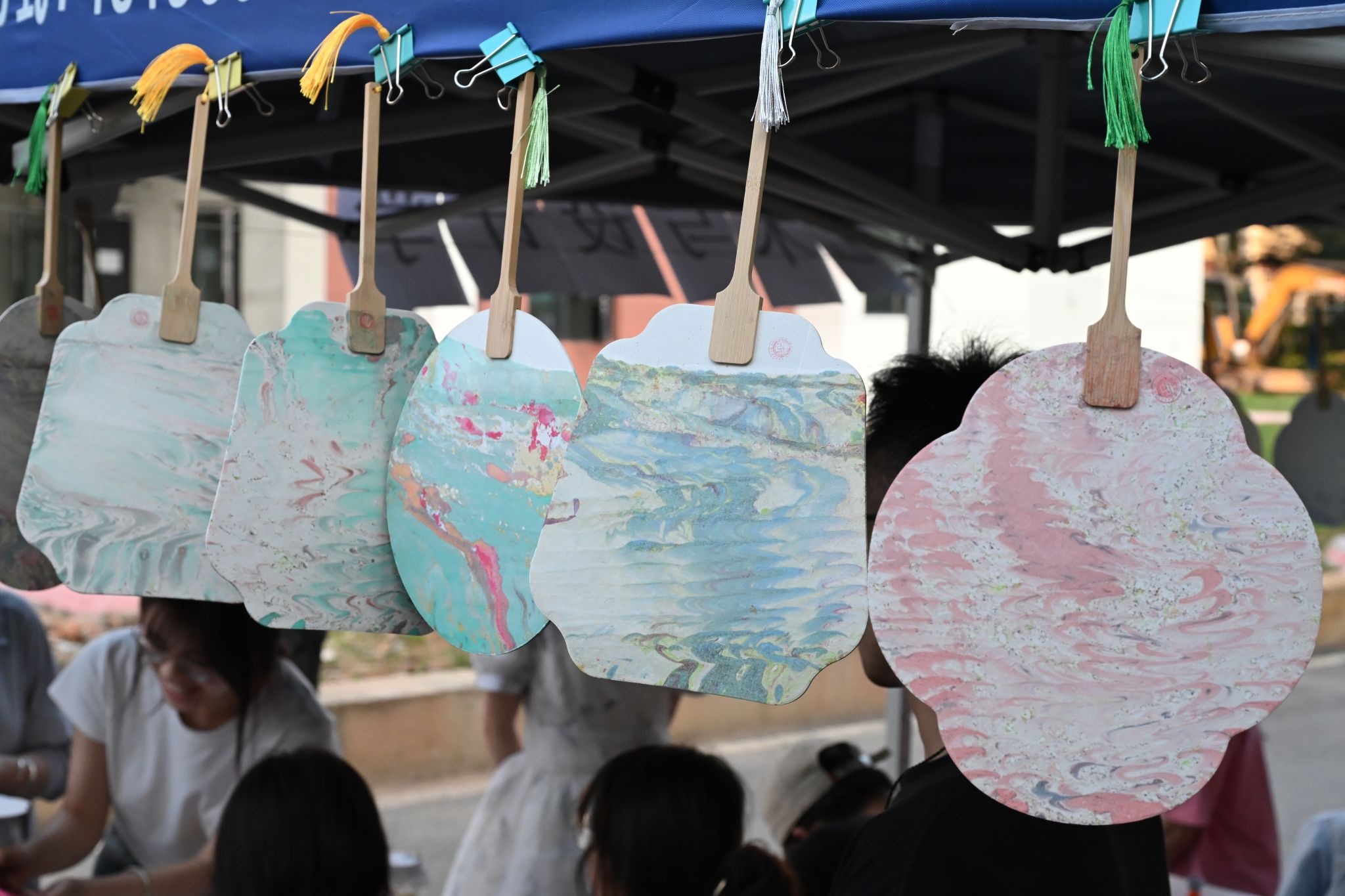 现场的制作展示环节尤为精彩。现场演示了水拓画和漆扇的制作过程,从材料选择到技法运用,细致入微地展示了传统技艺的魅力。同学们在观看中不仅学到了制作技巧,还被其中的艺术韵味深深吸引。