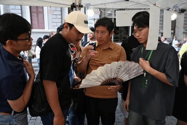 图中身着黄色衣服的顾客即是来自印度尼西亚的外国友人——苏里约诺·威查亚,对中华传统文化中的飘漆折扇颇感兴趣,观意的工作人员在一旁为其进行讲解、弘扬中华优秀传统文化,同时也从外国友人那边得到一些更加新颖的观赏角度与创作灵感。