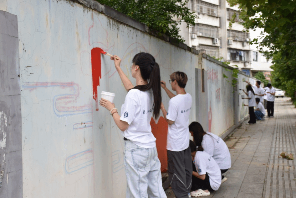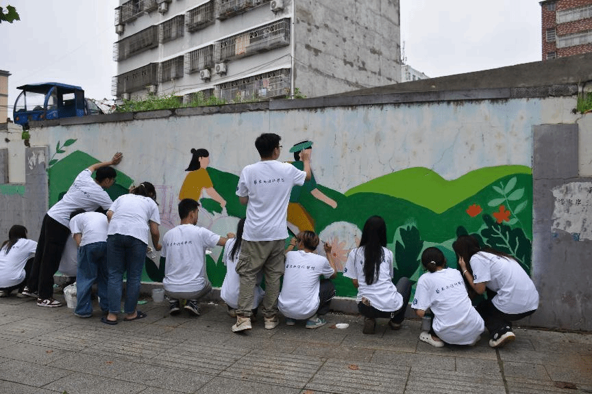 “艺梦启航”社会实践团在红安县城南大道东风社区开展“红色”文化和“绿色”文化主题墙绘活动。