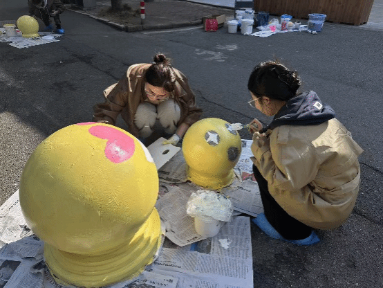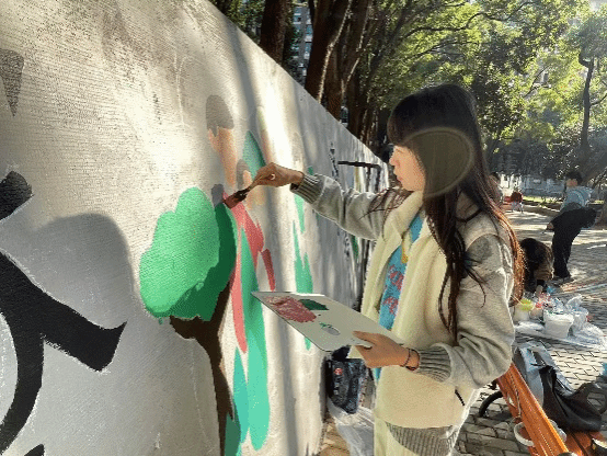 活动一开始,大家便热情高涨地投入到前期准备工作中,他们精心调配颜料,小心搬运绘画工具,细心用废弃报纸保护周围环境。紧接着,同学们将水泥墙和石墩视作创作的画布,巧妙地将彩绘图案与引人注目的标语融为一体。在绘画过程中,大家各司其职,从起稿、上色、勾线到相互协助、帮忙传递工具,整个流程井然有序。随着画布上图像逐渐成形,每个人的脸上都洋溢着喜悦之情,心中充满了成就感。