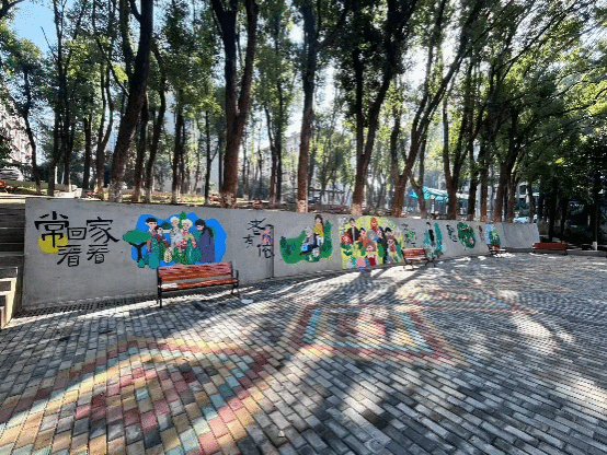 一笔一画绘文明,一墙一隅画美景。陈畅老师和同学们的共同创作,让社区中原本单调的墙面、石墩变得生机盎然,充满了活力与趣味。路过的社区居民们在墙绘前驻足观看,纷纷赞赏,“画得真好看,就像给墙‘穿’上了一件彩色的衣裳!”