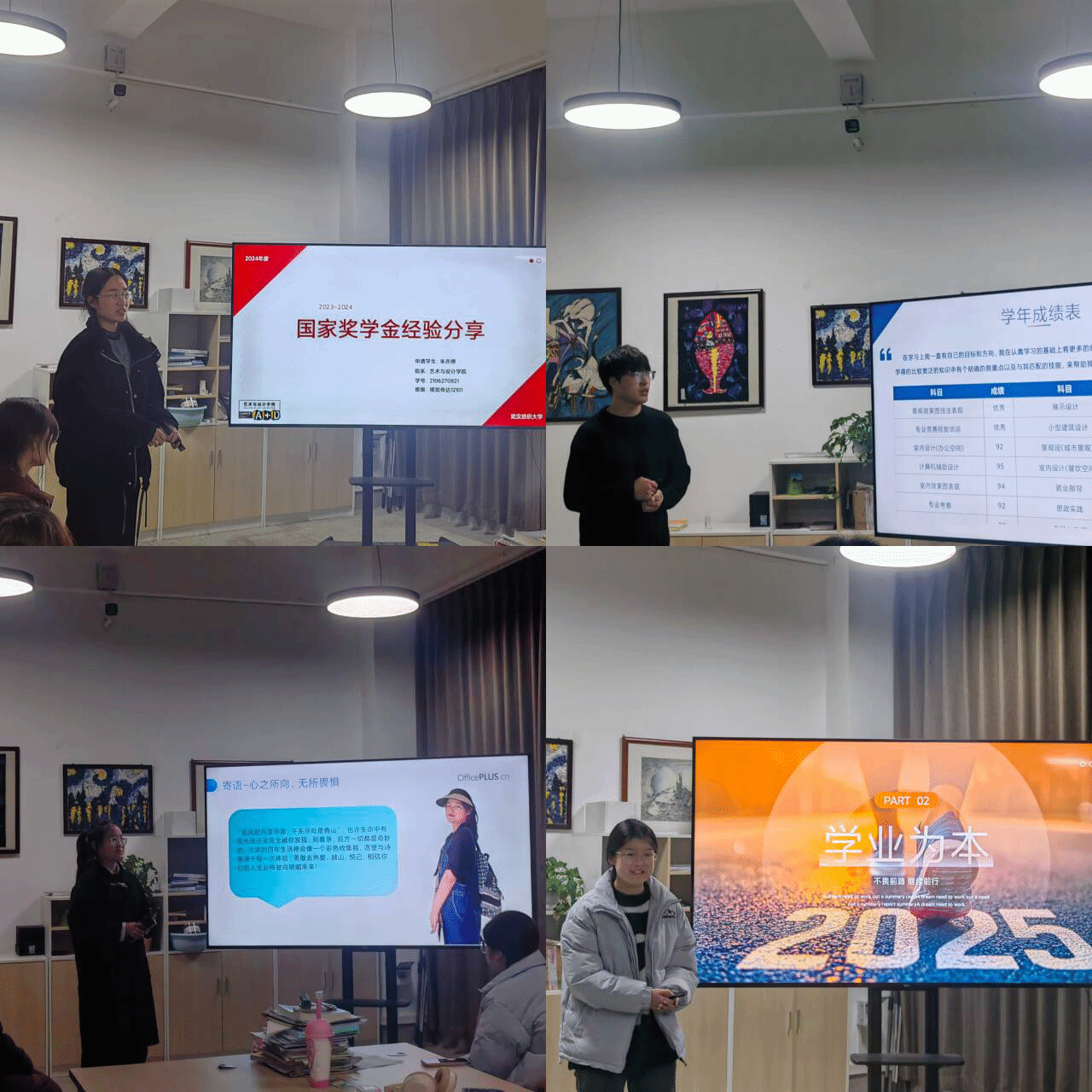 朱亦婷分享了她的学习经历与感悟,强调要明确自己的目标、提高学习与工作效率,对学习生活要有清醒的规划,不断提升自身专业能力。刘金志带领大家详细解读了课程综测分值及其组成架构以及各竞赛时间安排,帮助同学们充分认识和了解研究生课程的加分细则。陈心瑶特别强调了竞赛、科研项目对于学习生涯的重要性,鼓励同学们建立团队意识,在合作过程中提高团队协作能力。袁子惠介绍了自己的个人情况和课程成绩组成,为大家展示她的竞赛成果和志愿实践经历,分享了自身合作经验并强调其重要性,认为同学们要总结个人经验、形成属于自己的学习方式。