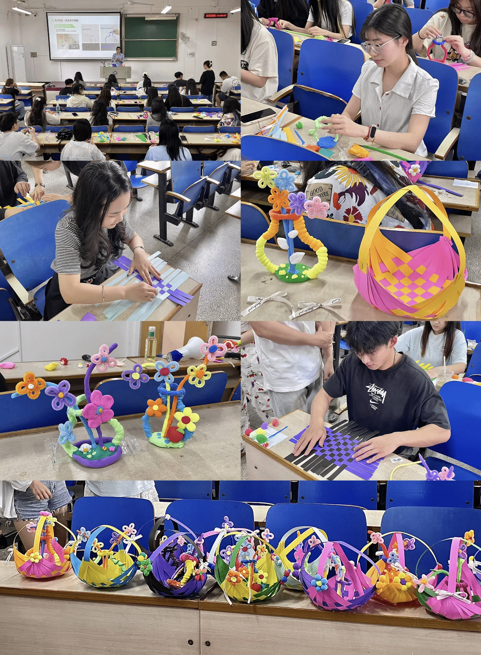 本次活动分为制作粘土花瓶和编制艺术花篮两个环节。活动伊始,主持人用有趣的色彩心理小活动来引导大家开启情绪感知状态,并对活动的内容及安全事项进行了讲解。在主持人的仔细示范和志愿者的细心帮助下,同学们通过揉捏、按压的方式尽情的发挥着自己的想象力,一个个色彩鲜艳、造型各异的花瓶在大家的巧手下诞生。随后,同学们又妙手翻飞,将裁成条的彩色厚卡纸轻轻勾起、交叉,编织出别具一格的纸编花篮。最后,在志愿者的指导下,大家用超轻粘土制作出各色花朵和叶片,精心装点着自己的作品。在这里,同学们忘却了学习的压力和生活的烦恼,他们相互交流、分享创意,全身心的投入到创作的快乐之中。