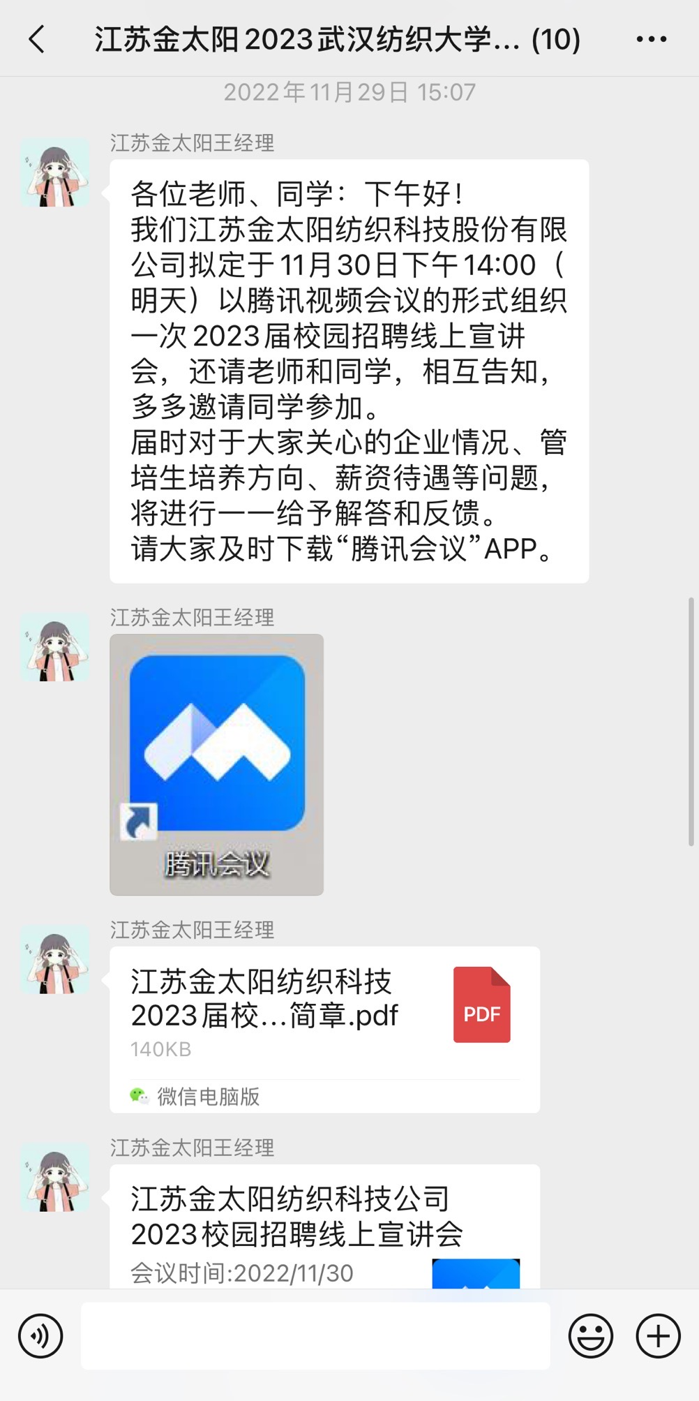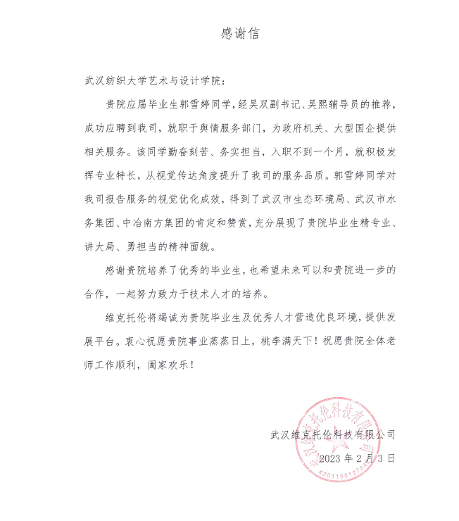 发来感谢信,感谢学院为企业、毕业生牵线搭桥,促进就业工作。