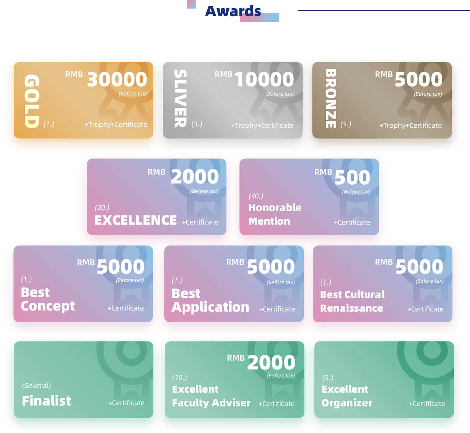 1. Entries shall be originally designed and finished by participants themselves and the contest committee shoulders no responsibilities for checking the ownership of entries. We reserve the absolute right to disqualify those who are charged with intellectual property rights theft. Participants need to guarantee that the contest committee won’t be involved in any copyright disputes when using their entries. The contest committee reserves the right to reject any entry that offends other countries’ cultures or is against to contest requirements. The contest committee and its units reserve rights to exhibit, publish(including electronic editions) and collect entries for the purpose of public benefit.