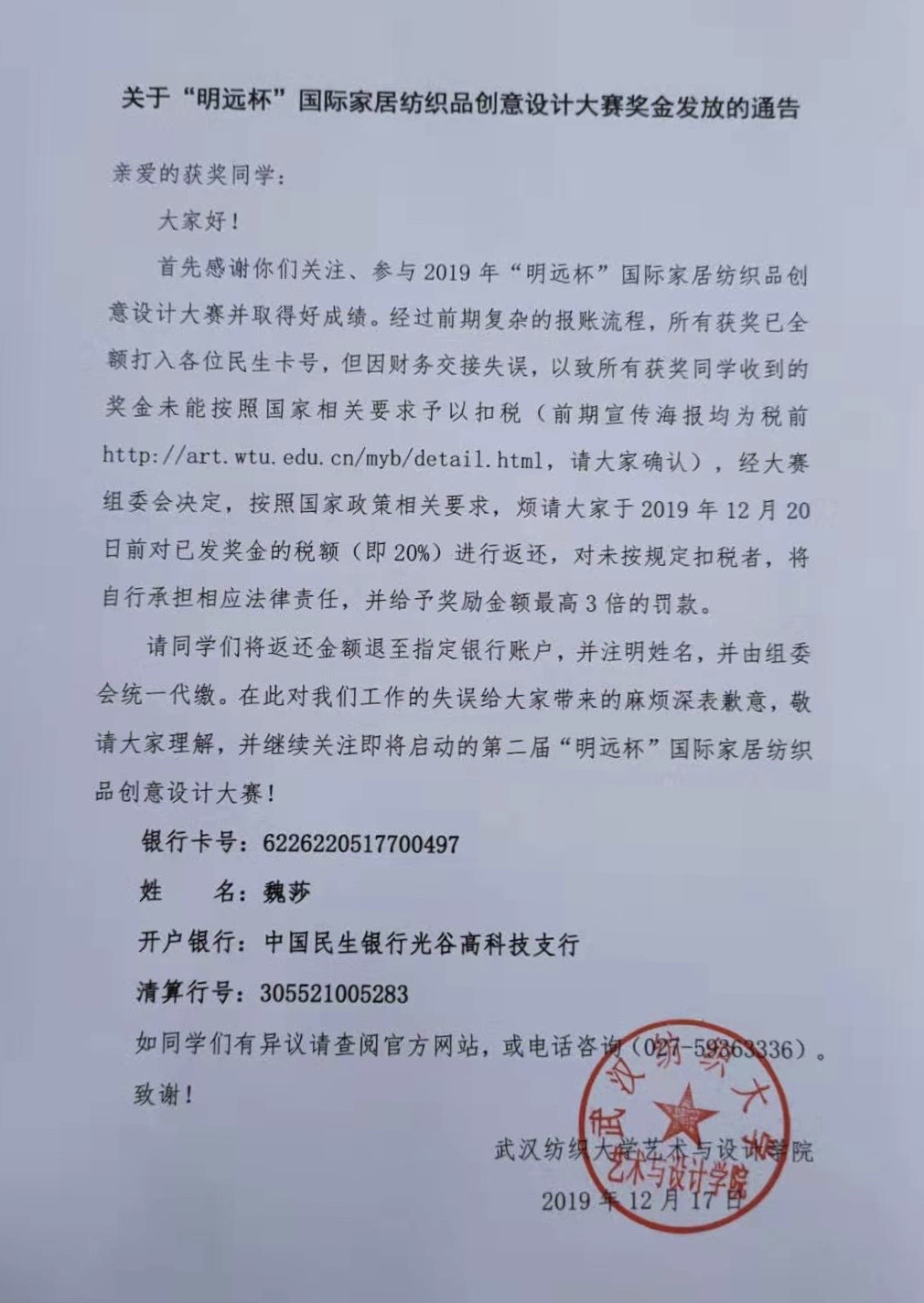 关于“明远杯”国际家居纺织品创意设计大赛奖金发放的通告